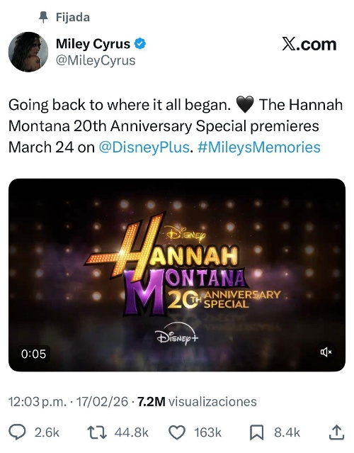 Miley Cyrus anunció que celebrará el 20. º aniversario de Hannah Montana, con un especial conmemorativo en el que revivirá los momentos, la música y los recuerdos que marcaron su etapa en la serie. La cantante participará en una entrevista conducida por Alex Cooper, donde hablará sobre el impacto que tuvo el programa en su vida y en la de sus fans.