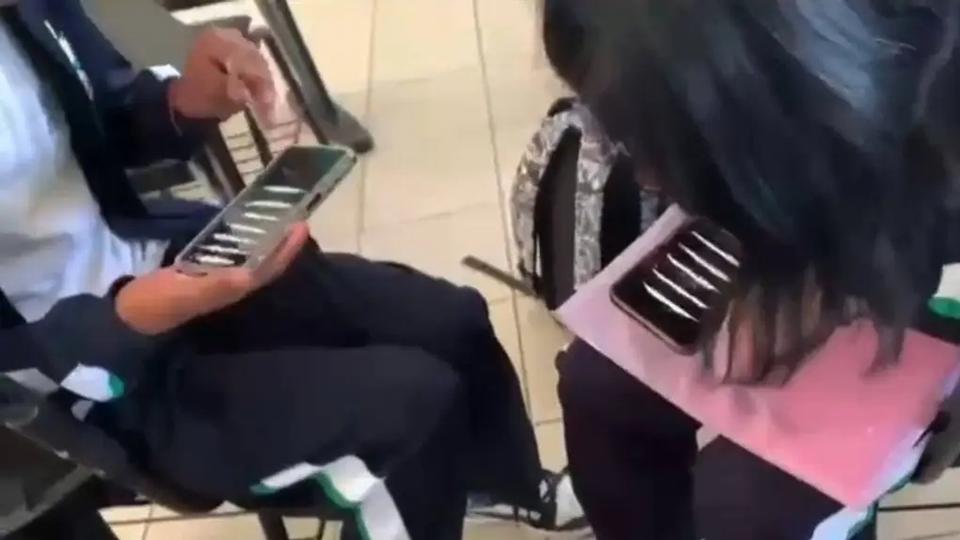 En las imágenes se pude observar a dos jóvenes, hombre y mujer, quienes portan el uniforme de la institución sentados cada uno en un pupitre. En sus manos, sostienen un teléfono celular, en cuya pantalla hay varias líneas de polvo blanco, las cuales inhalan con ayuda de lo que parecer ser un billete.